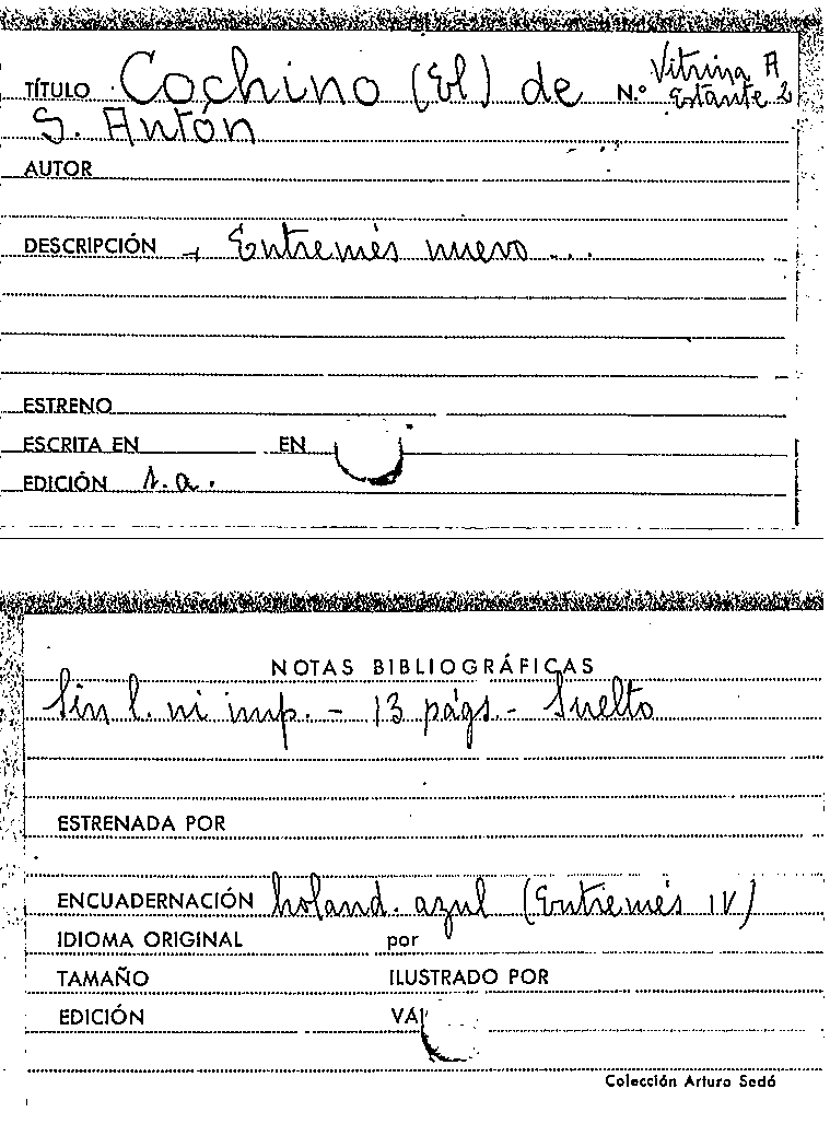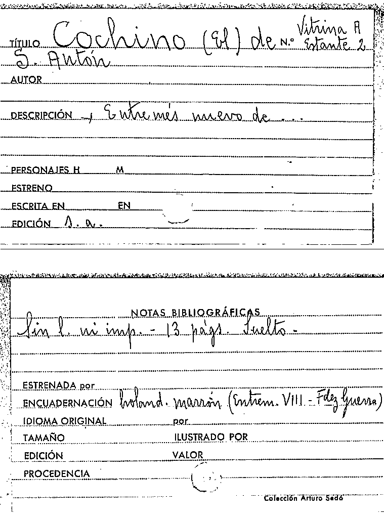 0112 VIT-043/09 Enquadernació holandesa marró amb puntes, nervis, guardes marbrejades, daurat al llom: Fernandez Guerra / Entremeses / I. Exemplar guillotinat afectant al text (15,30 cm). Etiqueta d'antic topogràfic al full de guarda volant anterior: Vitrina A Estante 2. Part del títol ratllat i substituït "nuevo" per "famoso" i "cochino" per "puerco". Les 4 primeres pàgines porten nombroses anotacions en el text i també banderoles amb text manusrit enganxades que volen substituir el text imprès. Anotació manuscrita en full [] davant del la pàgina de titol: "2643". Sumari manuscrit als fulls de guarda anterior de les obres que conté el volum, en el full de guarda de davant l'índex la següent anotació manuscrita en tinta negra: " 2656 al 2687 / Entremeses, contiene / ediciones del siglo XVII y XVIII / Algunas con viñeta / Marginaciones y apostillas / de letra de D. Aureliano / Fernández Guerra / Sin indice. A llapis: "Tomo 195. Fz Guerra. Relligat a la col·lecció factícia: Fernandez Guerra / Entremeses / I