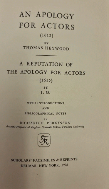 An apology for actors (1612) / by Thomas Heywood. A refutation of The apology for actors (1615) / by I.G. ; with introductions and bibliographical notes by Richard H. Perkinson