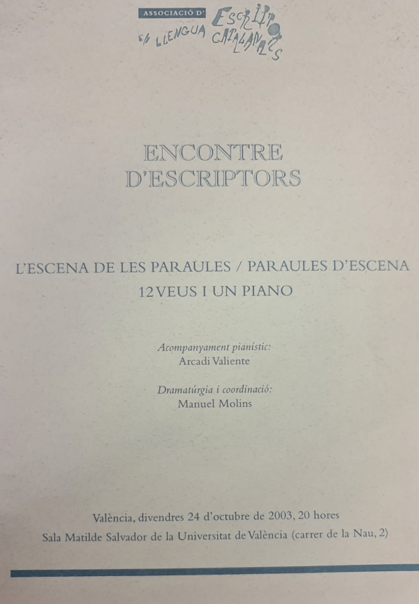 Recull dels textos de l'espectacle amb acompanyament pianístic: Arcadi Valiente ; dramatúrgia i coordinació: Manuel Molins, escenificat a València, divendres 24 d'octubre de 2003, Sala Matilde Salvador de la Universitat de València, en el marc de l'Encontre d'escriptors