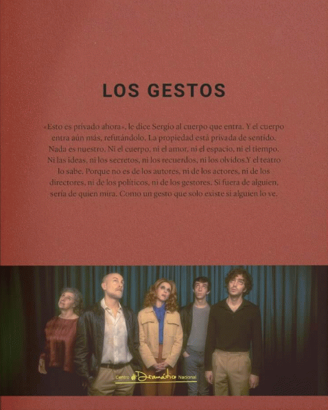"«Esto es privado ahora», le dice Sergio al cuerpo que entra. Y el cuerpo entra aún más, refutándolo. La propiedad está privada de sentido. Nada es nuestro. Ni el cuerpo, ni el amor, ni el espacio, ni el tiempo. Ni las ideas, ni los secretos, ni los recuerdos, ni los olvidos. Y el teatro lo sabe. Porque no es de los autores, ni de los actores, ni de los directores, ni de los políticos, ni de los gestores. Si fuera de alguien, sería de quien mira. Como un gesto que solo existe si alguien lo ve." -- Coberta
