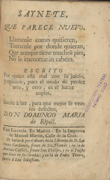 Saynete que parece nuevo : Llamenle como quieren, Tomenle por donde quieran, Que aunque tiene muchos pies, No le encontraràn cabeza / escrito por quien està mal con su juicio, y opinión, pues el modo de perder uno, y otro, es el hacer coplas. Sacale à luz, para que mejor se vean sus defectos, don Domingo Maria de Ripoll