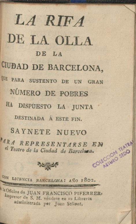 La Rifa de la olla de la ciudad de Barcelona : que para sustento de un gran número de pobres ha dispuesto la Junta destinada á este fin : Saynete nuevo para representarse en el Teatro de la Ciudad de Barcelona