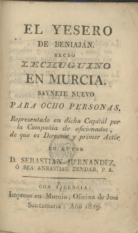 El Yesero de Beniaján, hecho lechuguino en Murcia : saynete nuevo para ocho personas : representado en dicha capitál por la compañía de aficionados, de que es directór y primer actór / su autor D. Sebastian Hernandez, ó sea Anbastise Zendar, P. A.