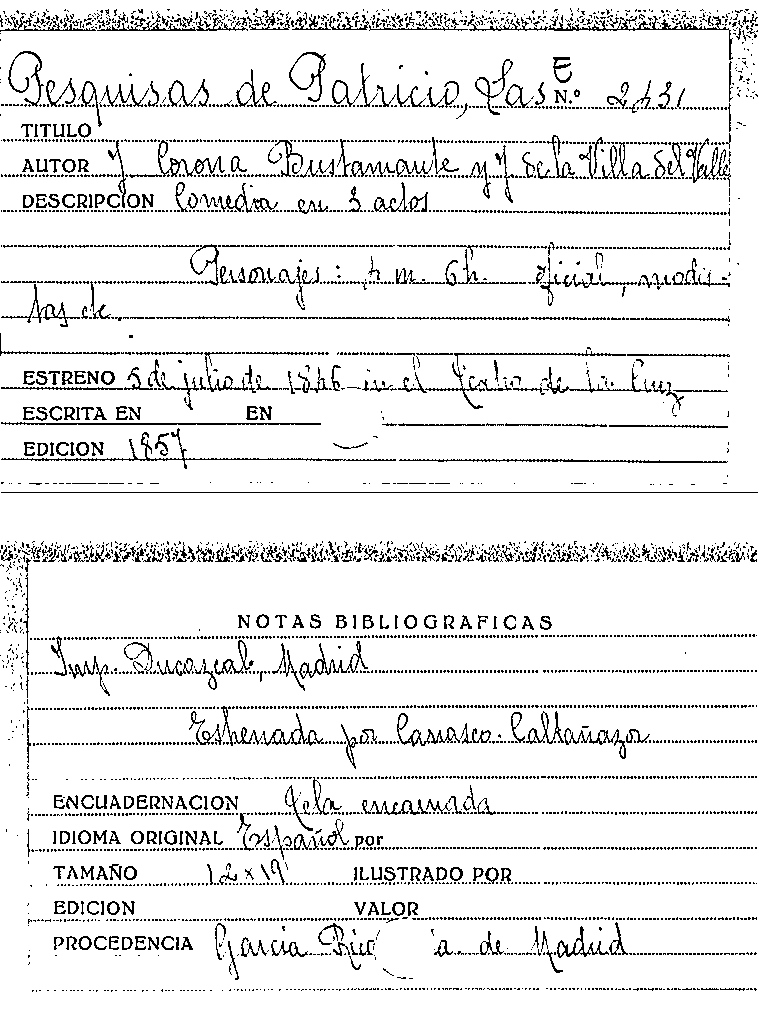 Las Pesquisas de Patricio : comedia en tres actos / arreglada a nuestro teatro por J. Corona Bustamente y J. de la Villa del Valle by