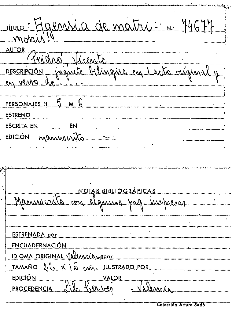 ¡Agensia de matrimonis! [Manuscrit] / Vicente Peydró Díez por