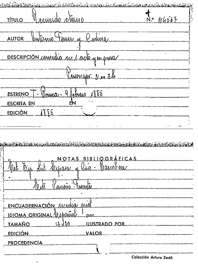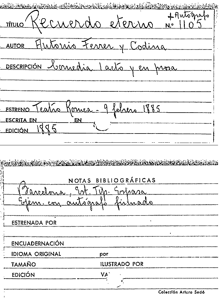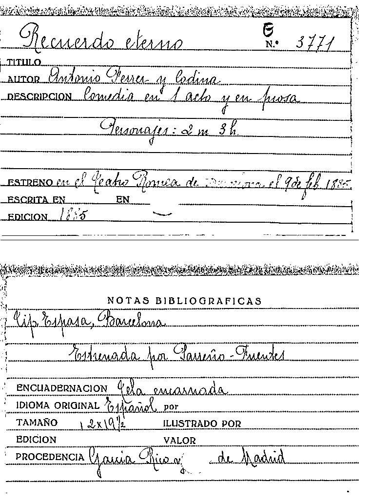 Recuerdo eterno : comedia en un acto y en prosa / por Antonio Ferrer y Codina by