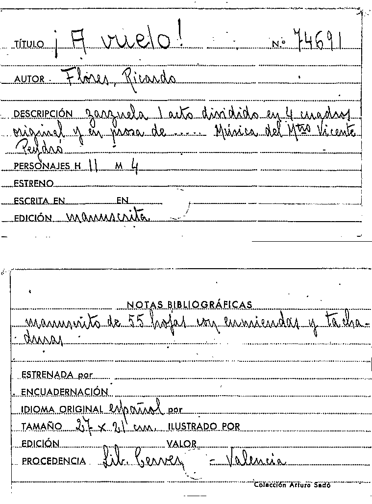 ¡A vuelo! : zarzuela en un acto dividido en 4 cuadros / [Manuscrit] / original y en prosa de Don Ricardo Flores ; música del maestro Don Vicente Peidró by
